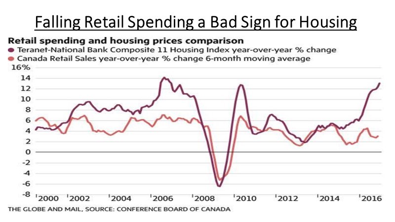 Canada’s real estate market continues to ride a euphoric wave of high prices and foreign buying, but at some point, all good things must come to an end. While we are not projecting any imminent demise in our housing market we are starting to notice some ‘cracks in the armour.’ While we all recognize that Canadian real estate does not look expensive compared to Hong Kong or some of the other centres where much of the foreign buying is coming from, the recent BC Provincial tax on foreign buyers has shown how susceptible this market has become to the sudden removal of that buying. A more worrying sign for us is the recent breakdown between retail spending growth and housing price increases in Canada, as shown in the chart below. They generally tend to move in tandem as rising house prices means consumers feel wealthier and they tend to spend some of that additional wealth which, in turn, keeps economic growth moving ahead. Also, rising home prices are generally indicative of a growing market which means that new buyers need to buy home accessories etc. But this relationship has fallen over the past year as home prices have continue to rise but retail spending growth has slowed down.